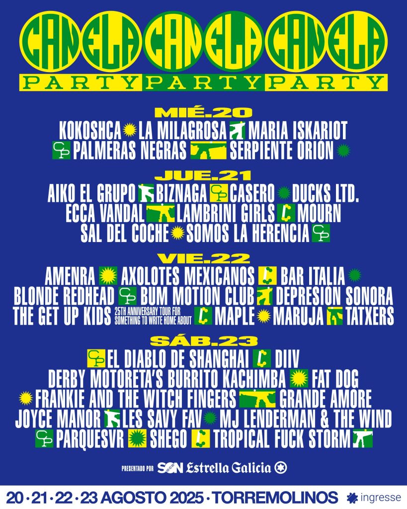 Y no se vayan todavía, aún hay más, pues no conviene olvidar que ¡el sábado 23 hay Fiesta de Disfraces! Toda una tradición del Canela Party que este año contará además con una banda sonora de lujo: Derby Motoreta’s Burrito Kachimba, el diablo de shanghai, DIIV, Fat Dog, Frankie and the Witch Fingers, Grande Amore, Joyce Manor, Les Savy Fav, MJ Lenderman & The Wind, Parquesvr, shego y Tropical Fuck Storm. Nuestro consejo: pensar en un disfraz cómodo, que permita bailar.