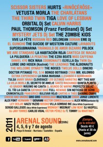 A falta de poco más de un mes para que arranque Arenal Sound 2011, ya se ha convertido en una de las citas musicales más esperadas y aclamadas del verano. De hecho, es probable que la segunda edición del festival cuelgue el cartel de “entradas agotadas” pocos días antes de su comienzo. Los “sounders” podrán disfrutar de fiestas temáticas, 10 días de acampada frente al mar Mediterráneo, fiestas en barco, actividades deportivas y más de 90 artistas de renombre nacional e internacional distribuidos por días tal y como se detalla a continuación: