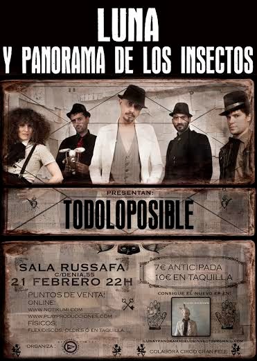 TODOLOPOSIBLE es el espectáculo que están preparando enValencia para el próximo viernes 21 de febrero en la sala Russafa. Muchas sorpresas nos esperan para nuestro primer encuentro con la banda tras la publicación de su primer trabajo. El universo sonoro de Luna y panorama de los insectos se desplegará sobre el escenario en un formato distinto de concierto, aproximando el concepto al de una opera o representación teatral. Una pieza continua que nos invitará a sentir a través de imágenes, el teatro de la palabra y la emoción, la poesía, el circo, y por supuesto, con música en directo.