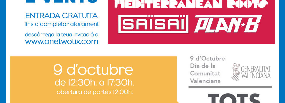 Atupa, VaDeBo, Mediterranean Roots, Saï Saï y Plan B serán los primeros en subirse al escenario que se situará en un espacio que este año también se ha convertido en un símbolo de la nueva Valencia: el edificio Veles e Vents de la Marina de València (antigua Marina Real). Lo harán el sábado 8 de octubre a partir de las 19.00, dentro de la programación especial de actos con motivo del 9 d’Octubre, Dia de la Comunitat Valenciana. A ellos se sumarán los nombres de Senior i el Cor Brutal, Gener, Mai Mai y Toni de l’hostal, que irán sucediéndose en las tablas a partir de las 12.00 del domingo.