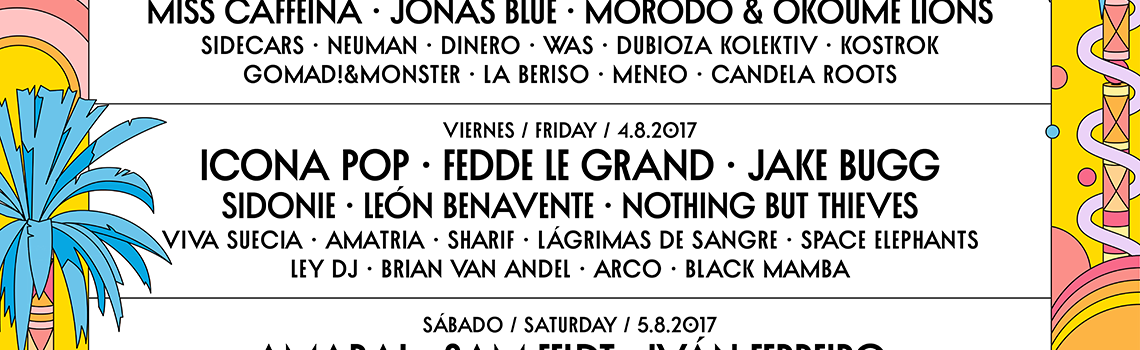 En cuanto a la programación musical, aún quedan artistas por confirmar y ya podemos adelantar que el próximo viernes 23 de junio se anunciará un DJ del Top 20 de la revista Dj Mag, y unos días más tarde se completará el cartel con más artistas que se unirán a la octava edición de Arenal Sound. El cartel por días ya se ha publicado y el jueves 3 de agosto es uno de los días más potentes con las esperadas actuaciones de Martin Garrix, Bastille, Jonas Blue o Lori Meyers; el viernes 4 de agosto está reservado para la primera actuación en España de Icona Pop, Fedde Le Grand, Jake Bugg o Sidonie; la jornada del sábado nos traerá grandes momentos con Amaral, Iván Ferreiro y Sam Feldt entre otros: y el domingo se cerrará a lo grande con Clean Bandit, Yellow Claw, Kase.O o Rayden.