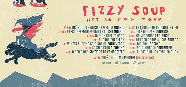 Coincidiendo con el lanzamiento del próximo vídeo clip «Beginners», los conquenses continúan con su extensa gira “Not so Far”, en la que están presentando su disco homónimo en alguno de los escenarios nacionales más reconocidos de la escena musical. 13 nuevas fechas en 17 días conforman esta etapa de la gira en la que Fizzy Soup recorrerá gran parte del norte de la península. Ciudades como León, La Coruña, Vigo, Pontevedra, Gijón o Logroño entre otras, serán testigo del contundente directo de la banda, en un periplo que se cerrará el próximo 16 de diciembre en el Café La Palma de Madrid, en la que será la última fecha del año de una de las bandas emergentes con más proyección del momento.