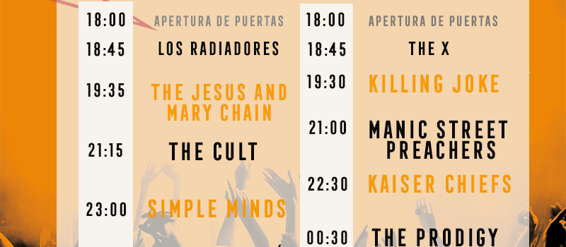 Las puertas del recinto se abrirán el viernes 29 a las 18:00h, en una jornada que inaugurará el sonido rock de la banda valenciana Los Radiadores (18:45h). Tras ellos llegarán los incombustibles The Jesus and Mary Chain (19:35h) con su nuevo disco ‘Damage and Joy’, seguidos por el ardiente guitarreo y las letras viscerales de The Cult, a las 21:15h.