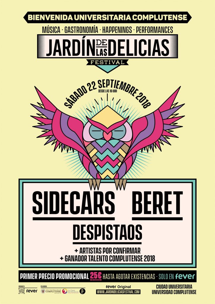 Sidecars, Beret y Despistaos son los primeros artistas confirmados para esta primera edición del Jardín de las Delicias, que abrirá sus puertas el sábado 22 de septiembre, en la Ciudad Universitaria de la Universidad Complutense de Madrid.