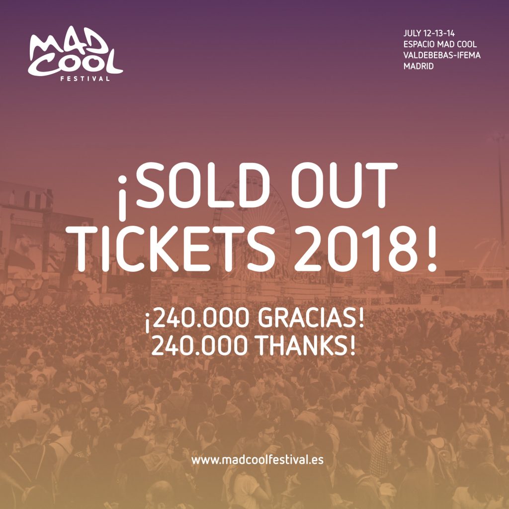 Es oficial: las 240.000 entradas para Mad Cool 2018 se han agotado. El festival, que este año celebra su tercera edición, ha conseguido su segundo sold out consecutivo (vendiendo 80.000 tickets para cada una de las tres jornadas) a una semana antes de su celebración que tendrá lugar los próximos días 12, 13 y 14 de julio.