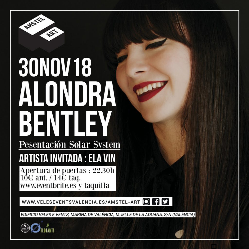 El próximo 30 de noviembre la sala Amstel Art albergará el concierto de la británica Alondra Bentley y la presentación de su último disco Solar System. Se trata del cuarto trabajo de la artista británica de orígenes españoles y con una marcada influencia musical basada en el folk más intimista que protagonizó sus comienzos. Ahora, con este último proyecto se acerca a nuevos estilos trabajados por la cantante como el rock y soul dando muestra de su versión musical más polifacética.