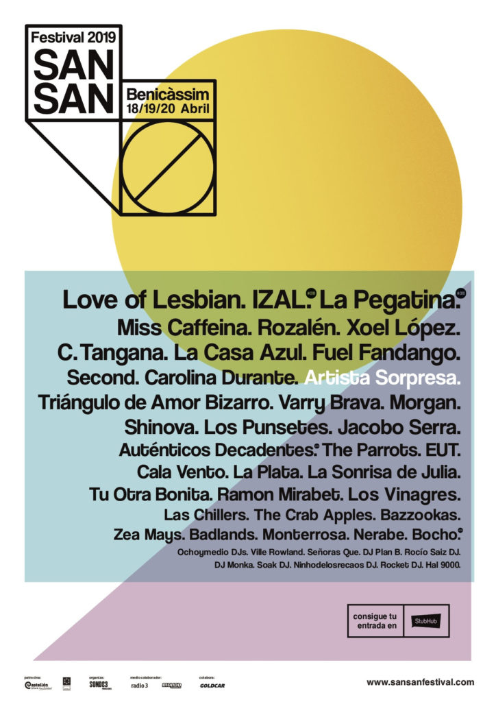 El cartel de SanSan 2019 está encabezado por artistas como Rozalén, Izal, Love of Lesbian, Fuel Fandango, La Pegatina, Morgan, C. Tangana, Miss Caffeina, La Casa Azul o Triángulo de Amor Bizarro, entre otros, e incluye la actuación de un artista sorpresa. Una propuesta eclética que, sin perder su filosofía indie- pop-rock, alterna el talento emergente con los grupos del momento. Un cartel de primer nivel que incluye la presencia femenina tanto encima como detrás del escenario.
