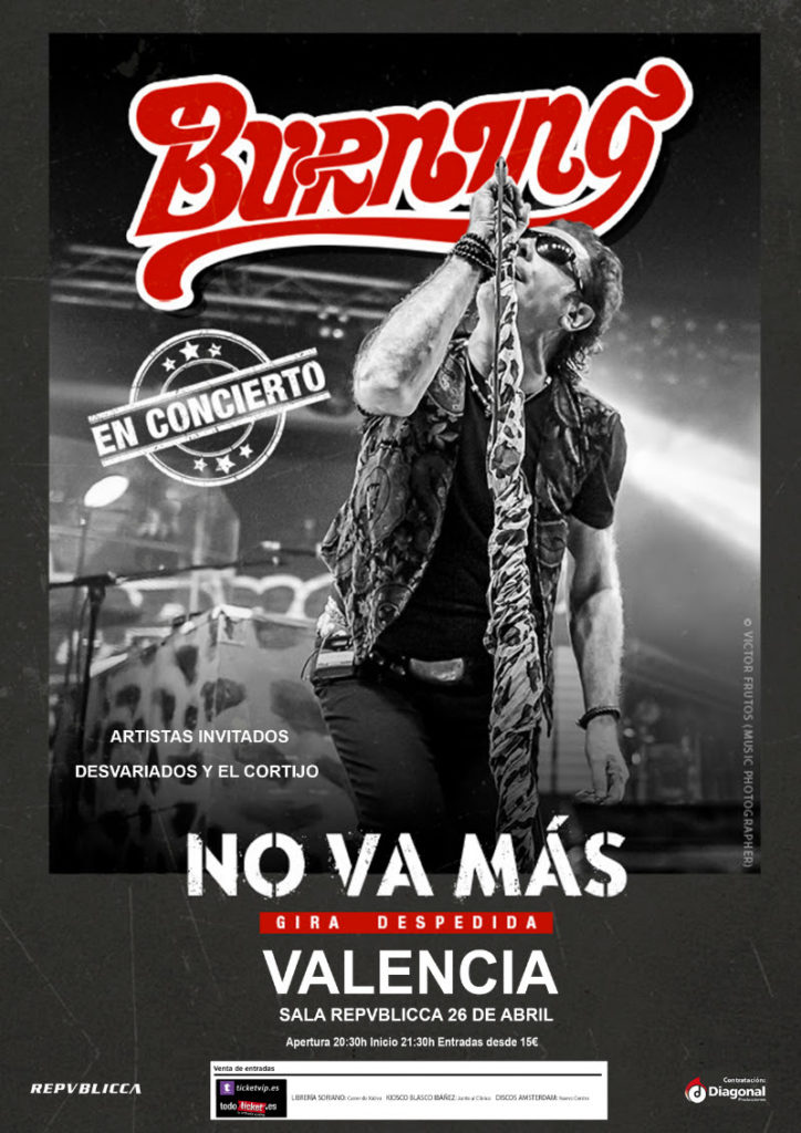 La sala Repvblicca de Mislata (València) acogerá el próximo viernes, 26 de abril, el último concierto en tierras valencianas de los rockeros Burning. La legendaria formación madrileña se despedirá así del público local en el marco de la gira “No va más”.