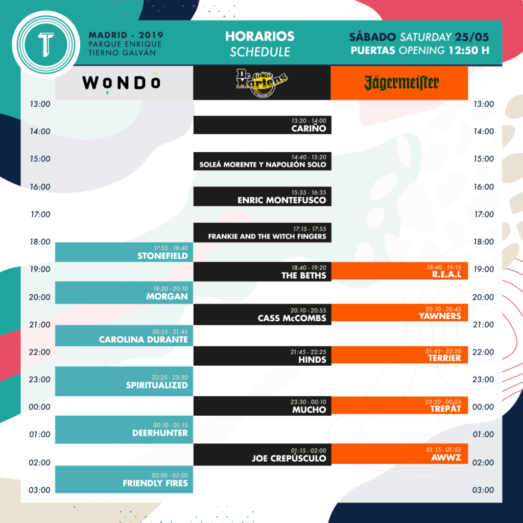 El sábado 25 de mayo, la primera banda en sonar por el recinto del festival será Cariño que, seguidas de Soleá Morente y Napoleón Solo, Enric Montefusco y Frankie and the Witch Fingers, se encargarán de poner patas arriba el escenario Dr. Martens desde primera hora.