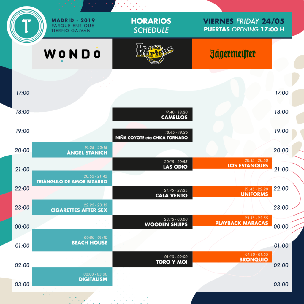 A partir de las 21:00h, la música de Triángulo de Amor Bizarro, Cala Vento y Uniforms, seguidos de Cigarrettes After Sex, Wooden Shjips y Playback Maracas reinará en las últimas horas del viernes antes de la medianoche. Beach House, Toro y Moi, Bronquio y Digitalism cerrarán la primera jornada de Tomavistas 2019.