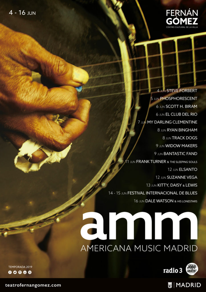 Falta un mes para que la primera edición de Americana Music Madrid (AMM’19) desembarque en el Fernán Gómez. Centro Cultural de la Villa, y ya está todo preparado para recibir a casi una veintena de grupos nacionales e internacionales que pondrán de manifiesto que la Americana progresa, sigue sumando y amplía horizontes. Steve Forbert, Phosphorescent, Ryan Bingham, Suzanne Vega, Dale Watson, Track Dogs, Bantastic Band, ElSanto o Kitty Daisy & Lewis son algunos de los nombres que forman parte de este amplio espectro de artistas que proponen diferentes interpretaciones de las raíces musicales americanas. Una propuesta que aúna maestros del género y nuevas generaciones que mantienen la americana en plena actualidad.