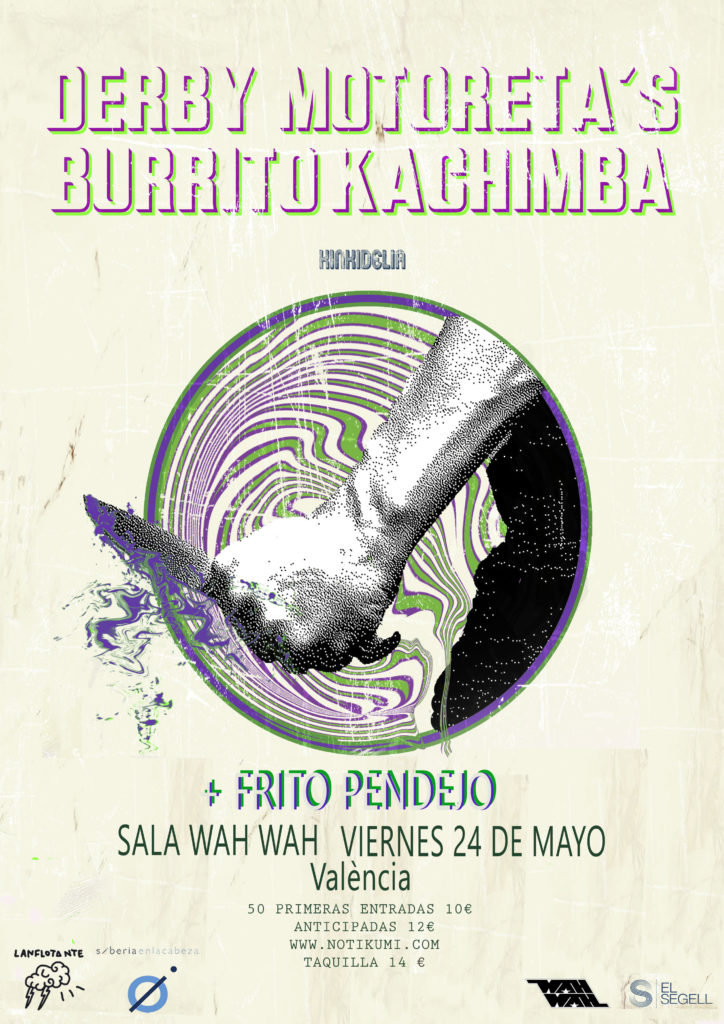 Este viernes 24 de mayo (23:00 horas) la Sala Wah Wah albergará el concierto de una de las bandas revelación de la temporada. Derby Motoreta’s Burrito Kachimba llega a Valencia para presentar su primer trabajo, ‘DMBK‘, trayendo bajo el brazo un lanzallamas de fuzz, una navajillah resién afiláh, escamas de hardrok y el mejor potaje de habichuelas de lata.