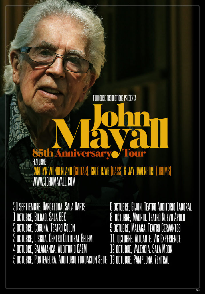 John Mayall, considerado una de las figuras claves de la música contemporánea, nos visitará en septiembre y octubre con una extensa gira para la que contará con la siguiente banda: John Mayall: voz, (teclados, guitarra, armónica), Carolyn Wonderland (guitarras), Greg Rzab (bajo eléctrico) y Jay Davenport (batería).