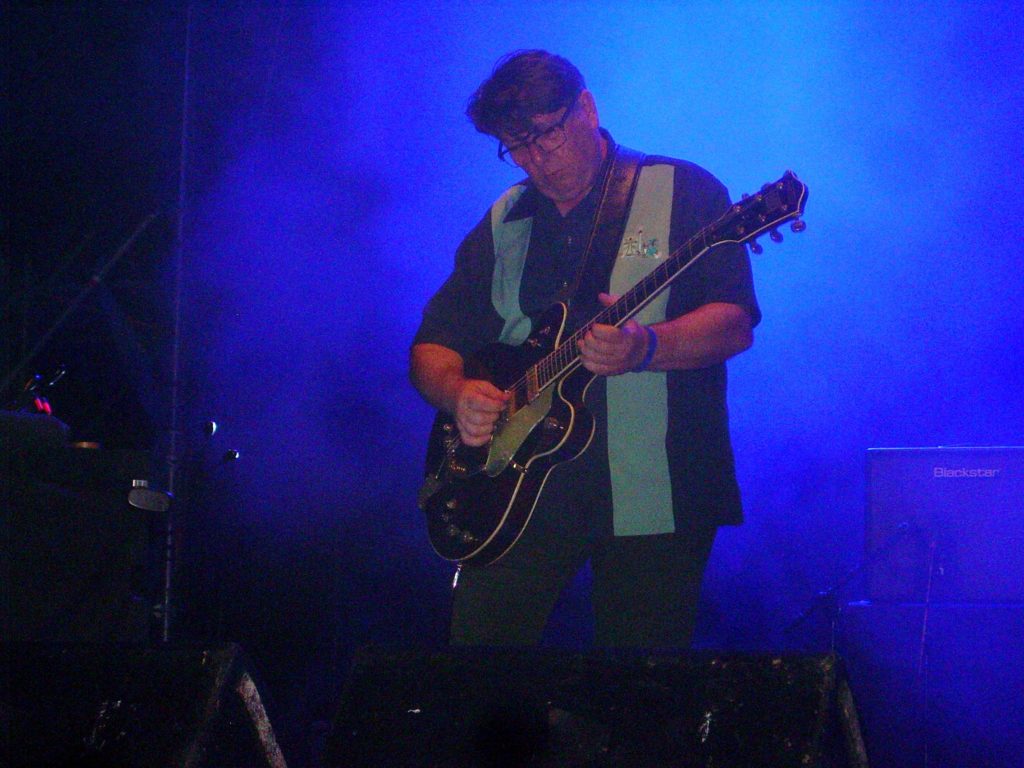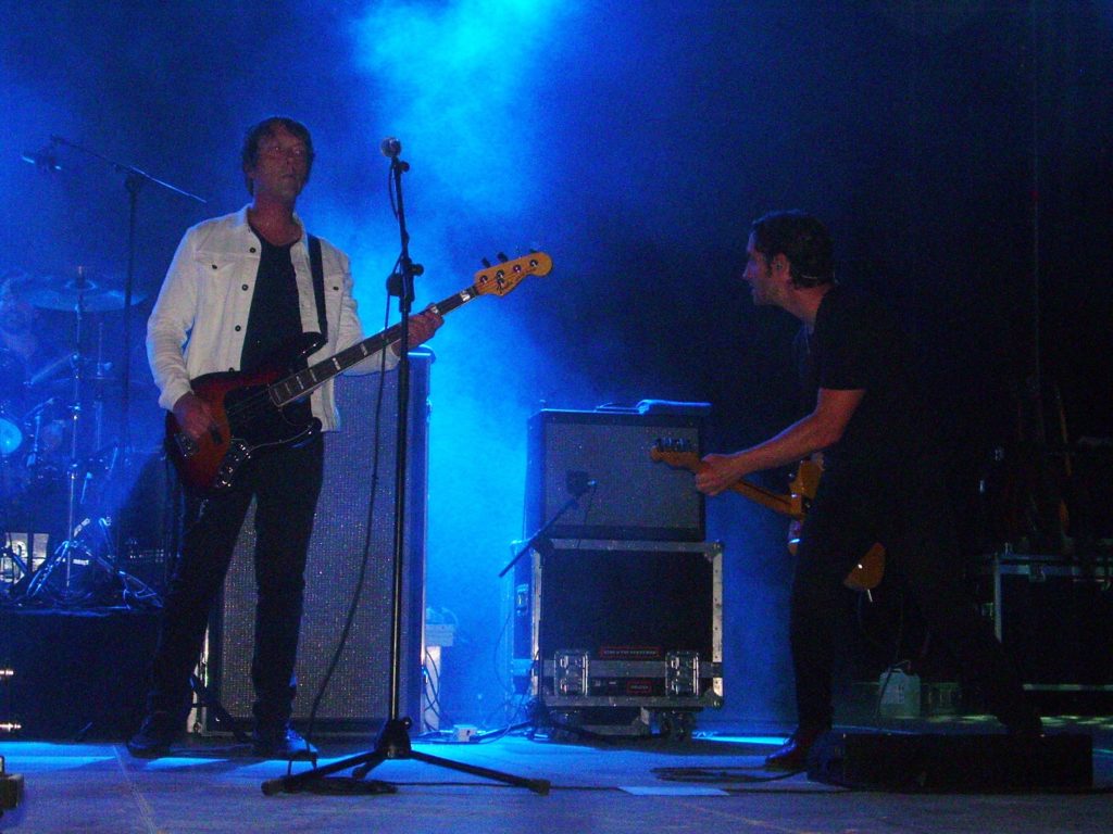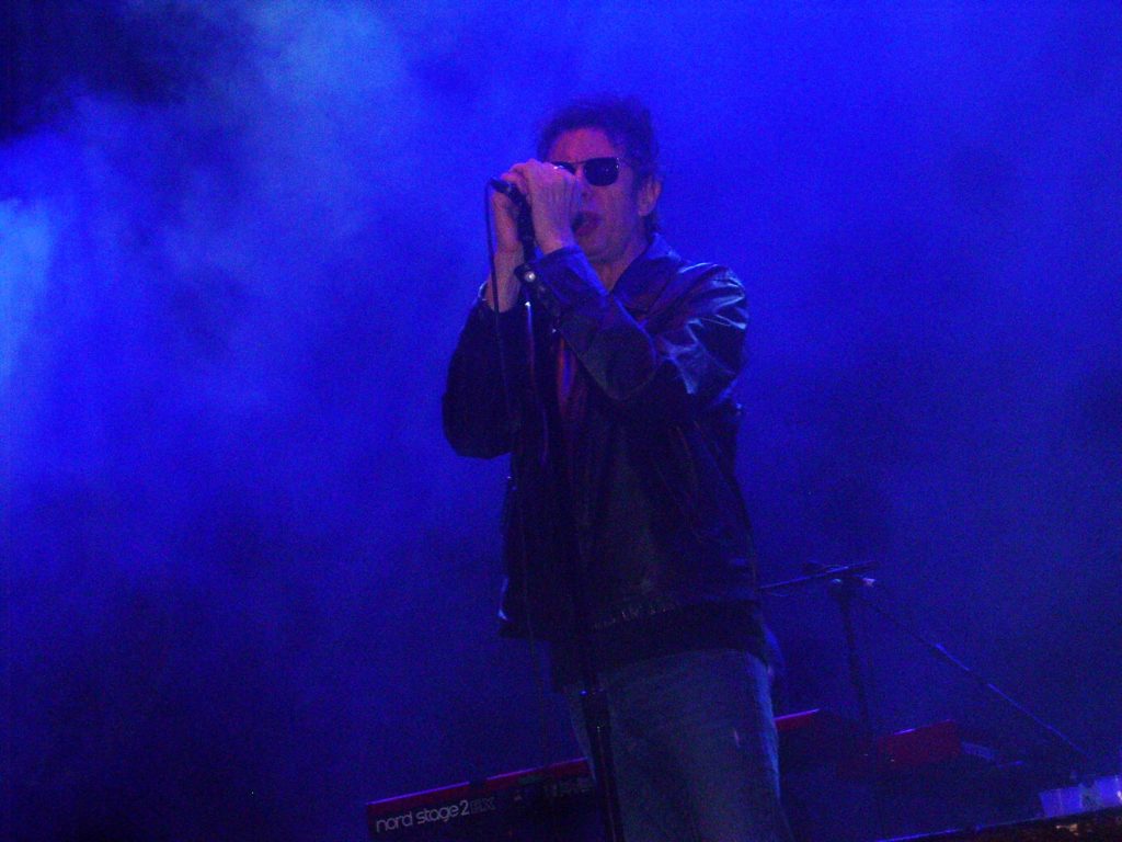 A continuación y también puntuales, a las 22.15 horas aparecieron Echo & The Bunnymen envueltos en una bruma artificial, que no cesó en todo el concierto, en ocasiones no se distinguía al batería y teclista y mucho menos las figuras que acompañaban a la iluminación, en tonos azules la mayor parte del set. Como hemos dicho, las canciones sonaron casi idénticas a las originales, en lugar de les reimaginaciones del álbum “The Stars, The Oceans & The Moon”, comenzando de manera enérgica con “Going Up” de su debut “Crocodiles”, seguida de “Bedbugs & Ballyhoos”, con McCulloch apoyando ambas manos sobre el micrófono. McCulloch, con cazadora de cuero, se mostró comunicativo y en un castellano chapurreado saludó con un “¿Cómo estáis?” al público, diciendo a continuación “Estoy muy feliz”. Su voz no se resintió, se mantuvo a un buen nivel durante todo el concierto, y Sergeant a la guitarra hacía verdaderas filigranas, con todo un arsenal a su disposición.