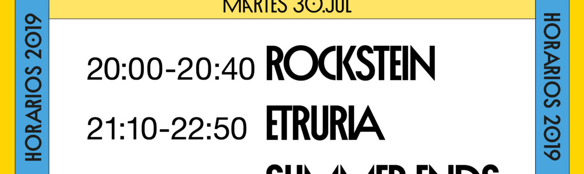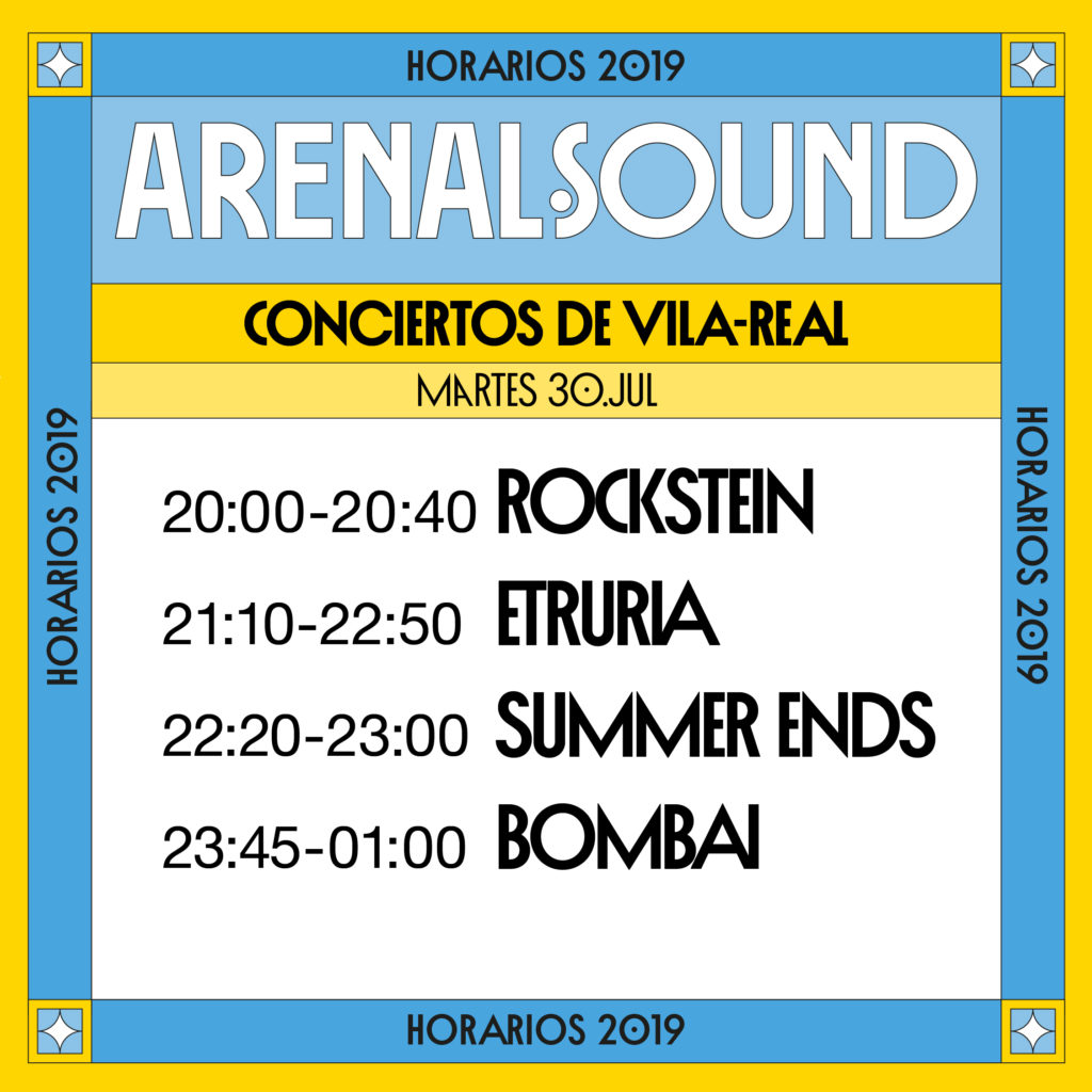 El martes 30 de julio disfrutaremos de la mejor música y el mejor buen rollo de la mano de los grupos locales Rockstein, Etruria y Summer Ends, y del conocidísimo grupo Bombai, con su ritmo tan fresco y veraniego. Los Conciertos de Vila-Real tendrán una duración entre las 20:00 y 01:00 de la noche. Además, si tienes Sounder Bus podrás hacer uso de este servicio especial para asistir a dichos conciertos que tendrán salida desde la zona de descanso Arenal a las 19:15 h., y la vuelta desde la calle Ermita, la parada de bus Carmelitas, a las 01:30 h.