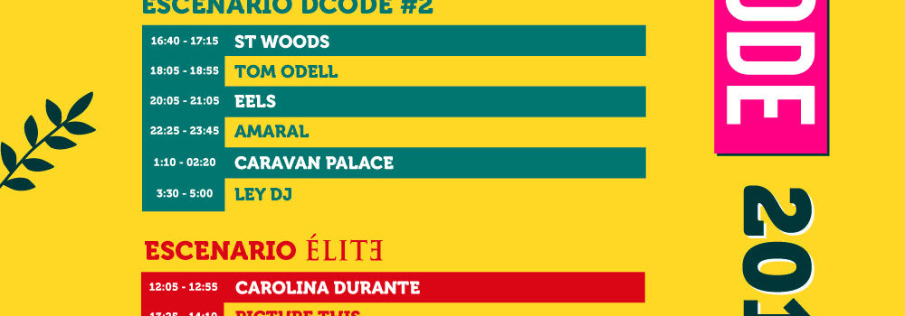 Queda poco más de una semana para celebrar la novena edición de DCODE y disfrutar de los conciertos de artistas como Two Door Cinema Club, Amaral, The Cadigans, Eels, Tom Odell, La Casa Azul, Caravan Palace, Viva Suecia, Miss Caffeina y muchos más. Consulta ya los horarios y programa tu día para que tu experiencia en DCODE 2019 sea inmejorable.