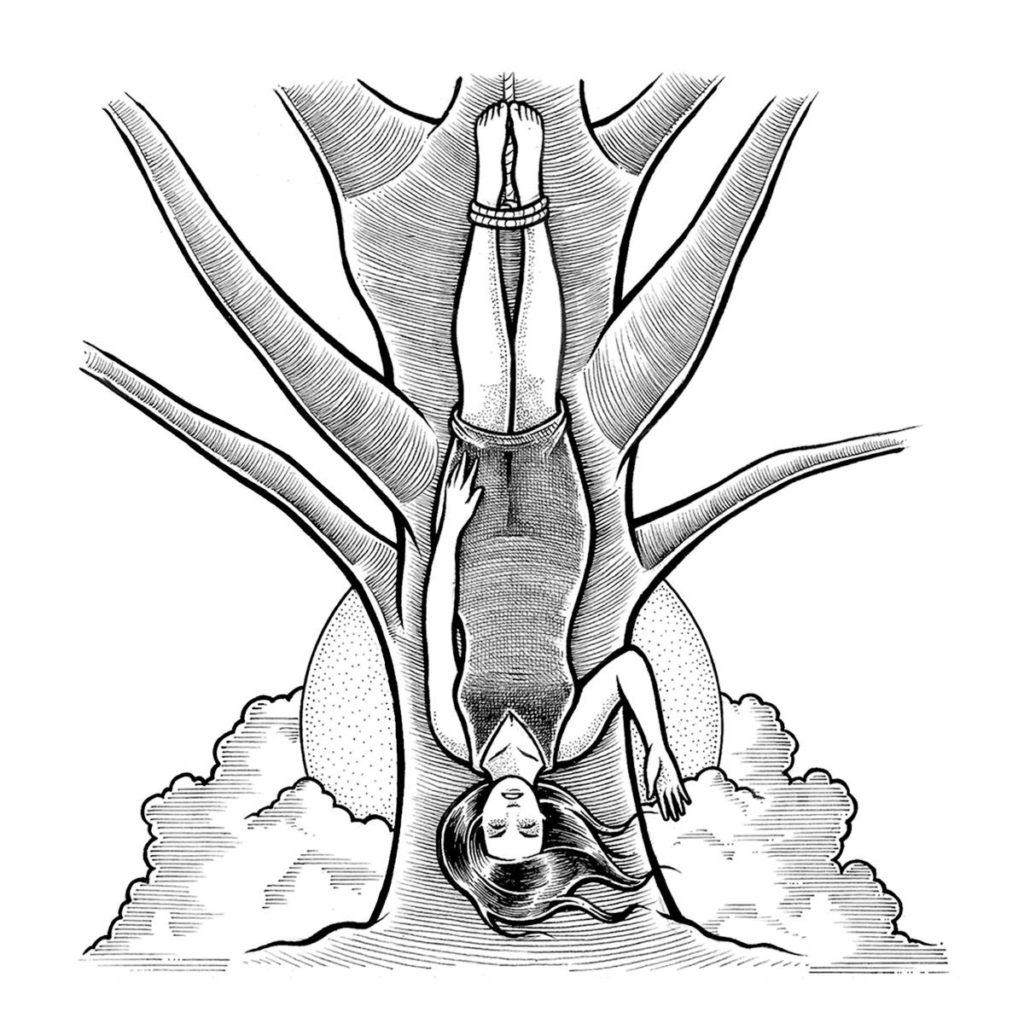 Una idea que ha ilustrado Mario Riviere, quien ha concebido para cada canción y cada hechizo una ilustración, en este caso, una chica colgada del revés de un árbol.