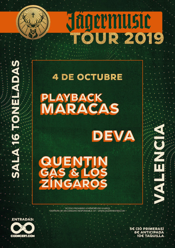 Jägermeister presenta una nueva edición del #JägermusicTour para otoño de 2019, cuyo objetivo es dar a conocer y apoyar al talento joven nacional y las propuestas underground, así como reivindicar el circuito de salas como hábitat natural de la música en directo. Actuarán en la sala 16 Toneladas de Valencia Playback Maracas, Deva y Quentin Gas & Los Zíngaros.
