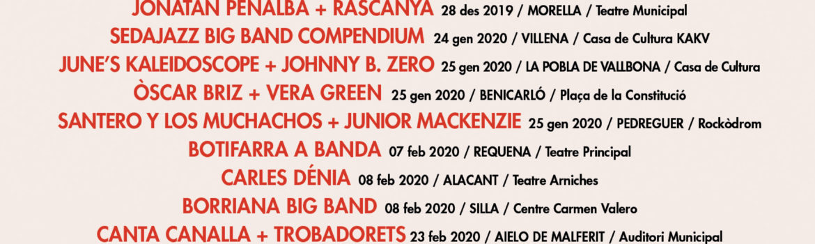 Ya en 2020, Sedajazz Big Band Compendium estarán en Villena el 24 de enero y June’s Kaleidoscope y Johnny B. Zero en La Pobla de Vallbona el 25 de enero. También el 25 de enero tendremos a Òscar Briz y Vera Green en Benicarló y a Santero y los Muchachos y Junior Mackenzie en Pedreguer.