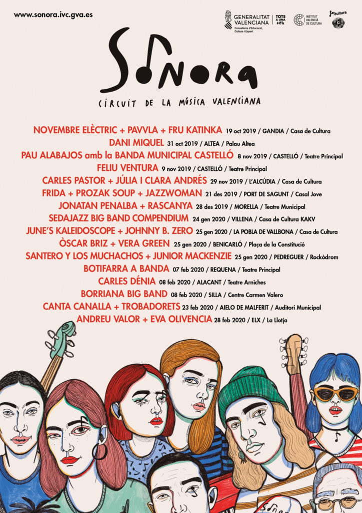 El circuito Sonora 2019-2020 integra 16 conciertos con un total de 27 propuestas musicales de solistas y grupos. El primer concierto tendrá lugar en Gandia el 19 de octubre y contará con Novembre Elèctric, Pavvla y Fru Katinka. Dani Miquel actuará el 31 de octubre en Altea. En Castelló, dentro de la programación del Trovam, la Fira Valenciana de la Música, encontramos el 8 de noviembre a Pau Alabajos con la Banda Municipal de Castelló y el 9 de noviembre, Feliu Ventura.