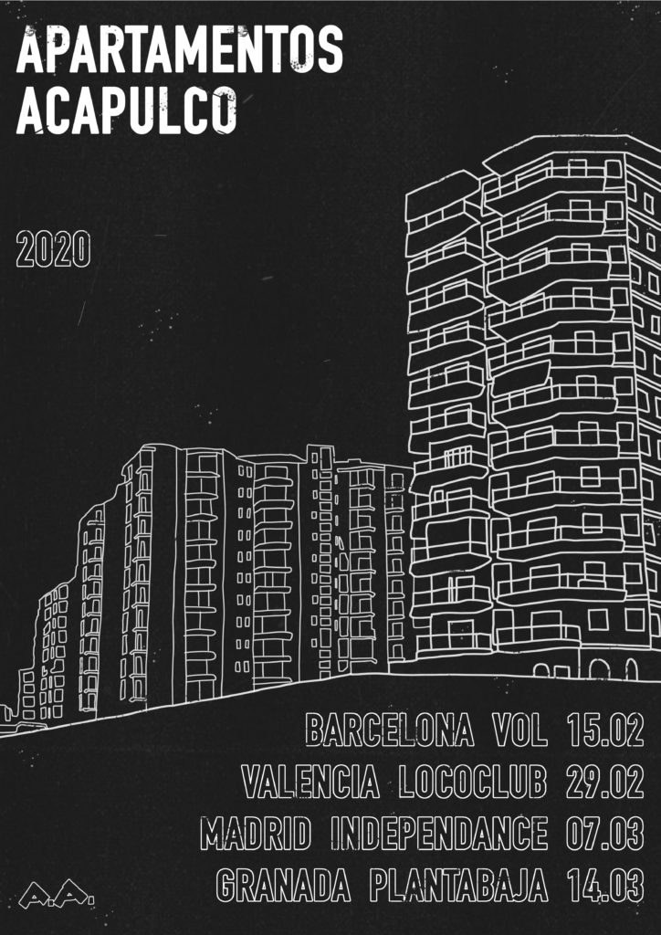 Después de un intenso año 2019 cargado de conciertos y un parón obligado, Apartamentos Acapulco vuelve a la carga con su gira por «El Resto del Mundo», presentando unas primeras fechas para el 2020 que podéis ver en el cartel.