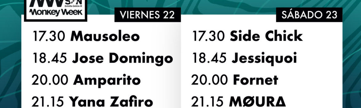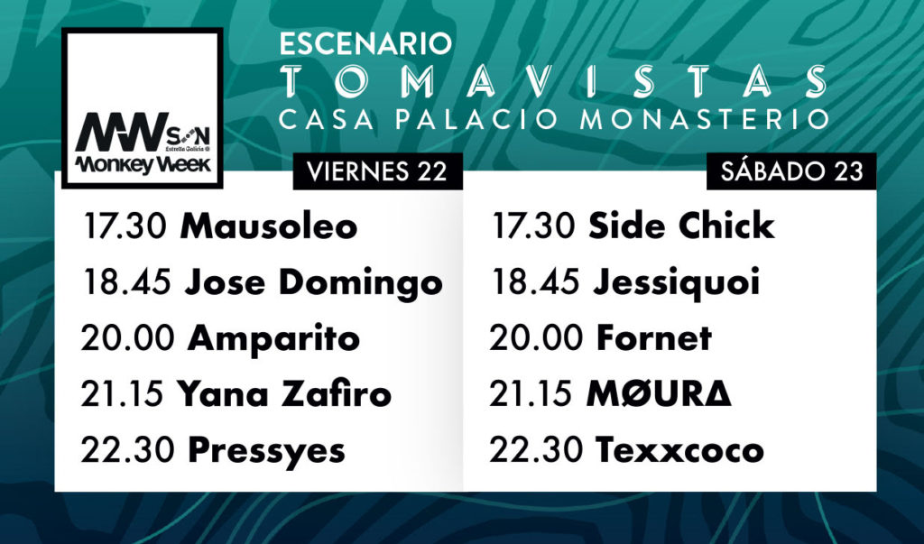 Ya están aquí los artistas confirmados para actuar en el escenario Tomavistas de la próxima edición de Monkey Week, que tendrá lugar en la Casa Palacio Monasterio de Sevilla el 22 y 23 de noviembre. Tomavistas nos presenta una variedad de grupos emergentes con estilos que oscilan entre el neo-punk más garajero, la psicodelia vaporwave, el rock más cañero, el pop meloso y la electrónica, con nombres como Texxcoco, Fornet, Pressyes, Mausoleo o Yana Zafiro.
