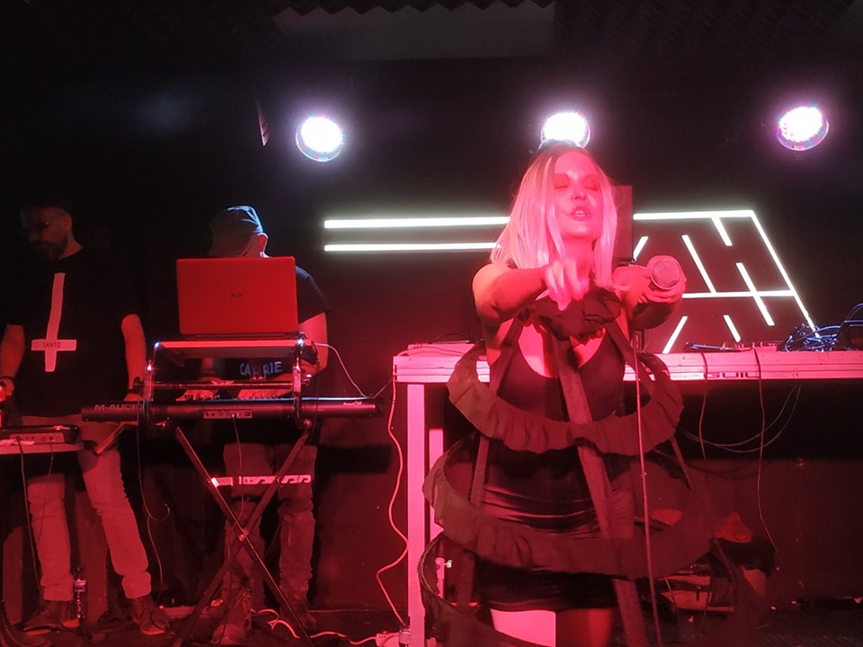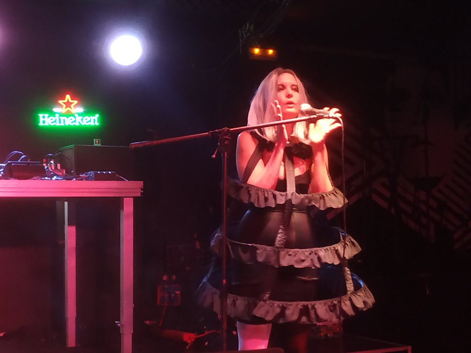 A medianoche, Irene Villar (voz), Juan Gregorio García (programación), Alfredo Sorlí (teclados, trombón y percusión) y El Autodidacta (guitarras) asaltaban el escenario desencadenando una sutil atmósfera sonora llena de matices inquietantes, arrancaba así El Futuro Peatón con el tema “Gettin Older”, una melodía densa que parece arrastrarse por el subsuelo subyugada por la gélida sensualidad que desprende la voz de Irene. Destaca además la propuesta estética de la banda, y es que extrapolan todo ese hervidero de sonidos dark e industriales a su puesta en escena, donde su frontwoman adquiere una presencia tan contundente como cautivadora: enjaulada en un atuendo de estructura cónica formada por aros, como una versión post-punk del vestuario del Ballet Triádico de Oskar Schlemmer, y describiendo puntuales movimientos mecánicos.