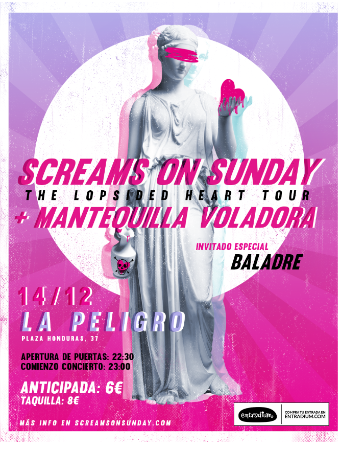 El grupo madrileño de rock alternativo Screams On Sunday estará presentando su último single «Lopsided Heart» en La Peligro el día 14 de Diciembre, compartiendo escenario con los grupos de Valencia Mantequilla Voladora y Baladre.