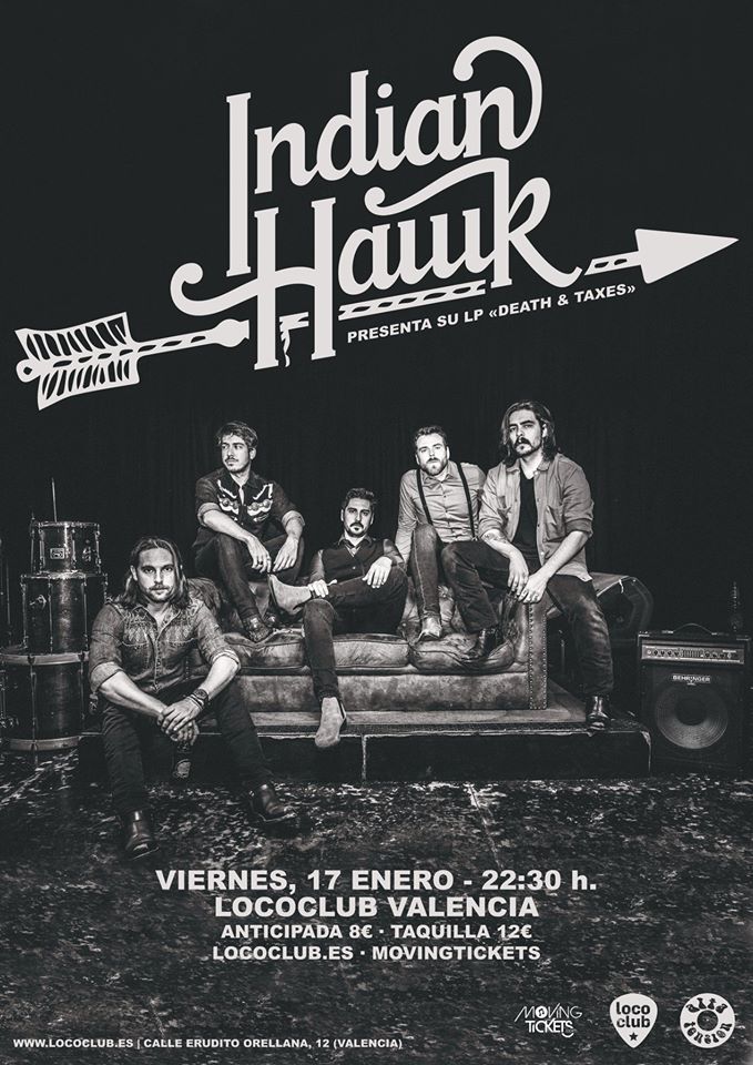 La banda valenciana de rock americana Indian Hawk, surgida de las cenizas de Red Buffalo, presenta su largamente anunciado disco debut, que lleva por título «Death & Taxes», el próximo viernes 17 de enero en Loco Club.