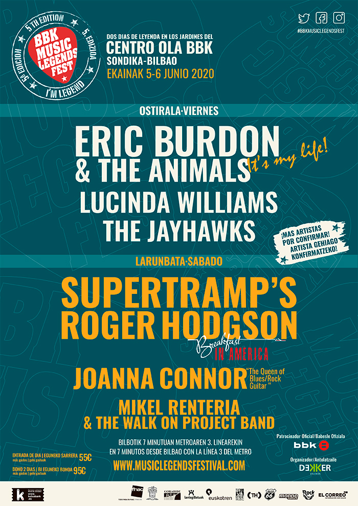 Eric Burdon & The Animals, Lucinda Williams y Mikel Renteria & The Walk on Project Band, se suman a los ya anunciados Supertramp’s Roger Hodgson, The Jayhawks y Joanna Connor, para esta 5ª edición del BBK Music Legends Festival, patrocinado por BBK y organizado por Dekker Events, que se celebrará los días 5 y 6 de junio de 2020 en el Centro Ola BBK de Sondika-Bilbao