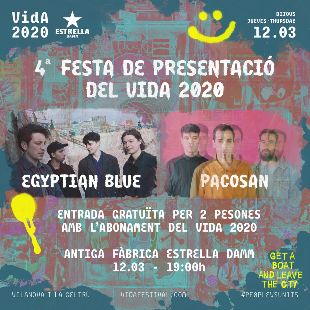 El próximo jueves 12 de marzo se celebrará la cuarta fiesta de presentación del VIDA 2020 en la Antiga Fàbrica de Estrella Damm (Roselló 515, Barcelona) con las actuaciones de Egyptian Blue y Pacosan.
