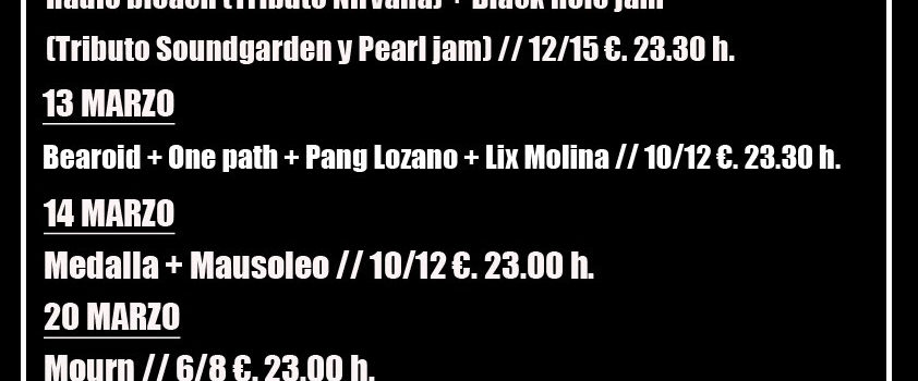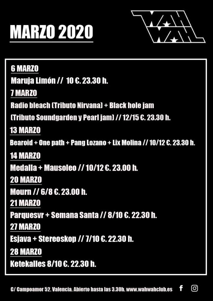 Esta es la programación musical de la sala Wah Wah para marzo de 2020, en la que destacamos los conciertos de Mourn, Medalla y Mausoleo, Bearoid, Esjava con Stereoskop y Parquesvr con Semana Santa.