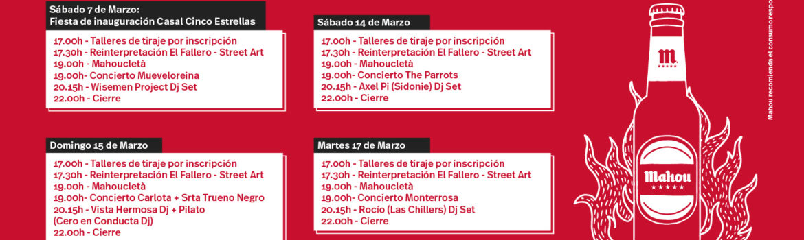 Mahou inaugura el próximo sábado 7 de marzo el Casal Cinco Estrellas, una iniciativa con la que la marca se suma a las Fallas. Esta experiencia única llevará al Centre del Carme una programación innovadora, multidisciplinar y gratuita desde las 17:00h hasta las 22:00h. La tarde comenzará con los talleres de tiraje para aprender a tirar -y saborear- la caña maestra, una actividad gratuita que ya cuenta con todas las plazas cubiertas.
