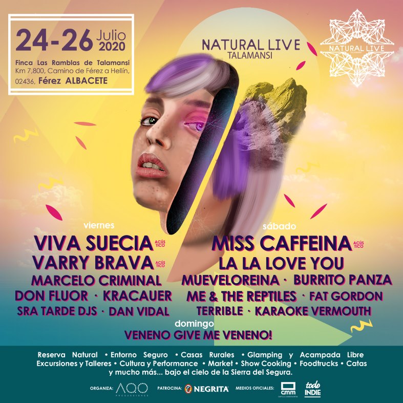 Bienvenidos todos a Natural Live 2020, un nuevo ciclo boutique, de eventos musicales, que se celebrarán durante el verano de 2020 -julio y agosto- en el entorno de la finca Las Ramblas de Talamansi, una amplísima reserva natural situada, al aire libre, en plena naturaleza serrana, en las inmediaciones de Hellín (Albacete), cerca de Férez, en donde, además, podrás alojarte -en casas rurales y glamping- para gozar cómodamente de una experiencia Natural Live 360º.