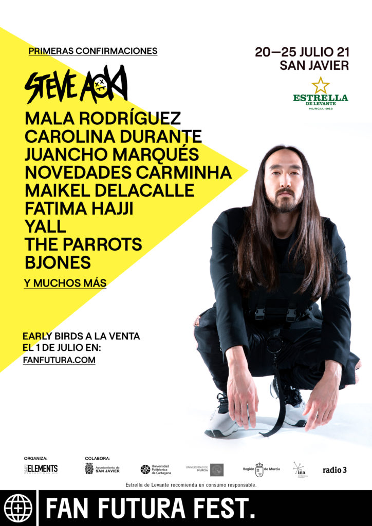 El nuevo gran festival de la Región de Murcia, Fan Futura Fest, que se celebrará del 20 al 25 de julio de 2021 en San Javier, despega por todo lo alto presentando a Steve Aoki, Mala Rodríguez, Juancho Marqués, Carolina Durante, Novedades Carminha, Maikel Delacalle, Fatima Hajji, Yall, The Parrots y B Jones.