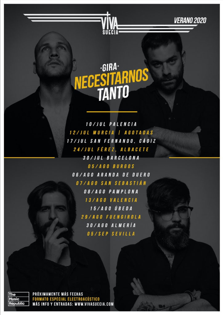 La actual crisis sanitaria alcanzó a Viva Suecia en medio de la presentación de “El Milagro”, su inmenso tercer disco, el que les ha colocado en el olimpo de la escena del rock independiente nacional, una gira ambiciosa para la que tenían preparado un apabullante show de sonido y luces. Con una legión de fans agotando las entradas para salas de miles de personas y su nombre encabezando los carteles de los principales festivales ha habido que hacer un paréntesis. Todo esto continuará, pero las ganas de seguir divirtiéndose seguían ahí. Surgió así la posibilidad de idear un nuevo espectáculo, más íntimo, pero con los cinco miembros de la banda sobre el escenario, ofreciendo una nueva mirada sobre un repertorio que los asistentes a estos conciertos podrán disfrutar con una cercanía que en otro contexto habría sido muy complicada. Se trata de una serie de recitales adaptados a las medidas decretadas por las autoridades competentes en los que la prioridad será la salud y seguridad de todos los asistentes, pero también la de disfrutar de un directo único en un momento muy especial. Esta gira comenzará esta misma semana el 10 de julio en el Palencia Sonora, y el 12 en Murcia, donde se agotaron todas las entradas disponibles para verlos en Las Noches del Malecón en menos de media hora. Después pasará por San Fernando (Cádiz) el 17 de julio, y de allí al Natural Live en Férez (Albacete) el 24 de julio, el 30 de julio actuarán en el Camp Nou de Barcelona dentro del ciclo XXS Cruilla. Ya en agosto Viva Suecia actuarán en Burgos el día 5, el 6 estarán Aranda de Duero, en la edición especial de este año de Sonorama, el 7 en San Sebastián en el Kursaal, y el 8 en Las Noches en la Ciudadela de Pamplona. Esta gira también visitará el 13 de agosto el ciclo Republic Alive de Valencia, el 15 el Festival de Verano de Úbeda, el 29 el Marenostrum Fuengirola y el 30 el Cooltural Fest Go! De Almería, para terminar, por el momento, el 5 de septiembre en el ciclo Sevilla Alive. Más fechas se confirmarán en las próximas semanas.