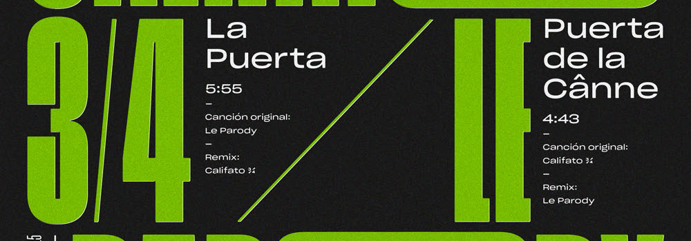Este split, de edición limitada, y cuyo diseño ha sido realizado por Ricardo Barquín Molero, ya se puede adquirir en pre-order. Pero antes, como primer adelanto, ya está disponible «La Puerta»: la versión o remix libre que Califato ¾ hacen de una de las canciones más intensas e inmensas de Le Parody, perteneciente a su último LP, «Porvenir».