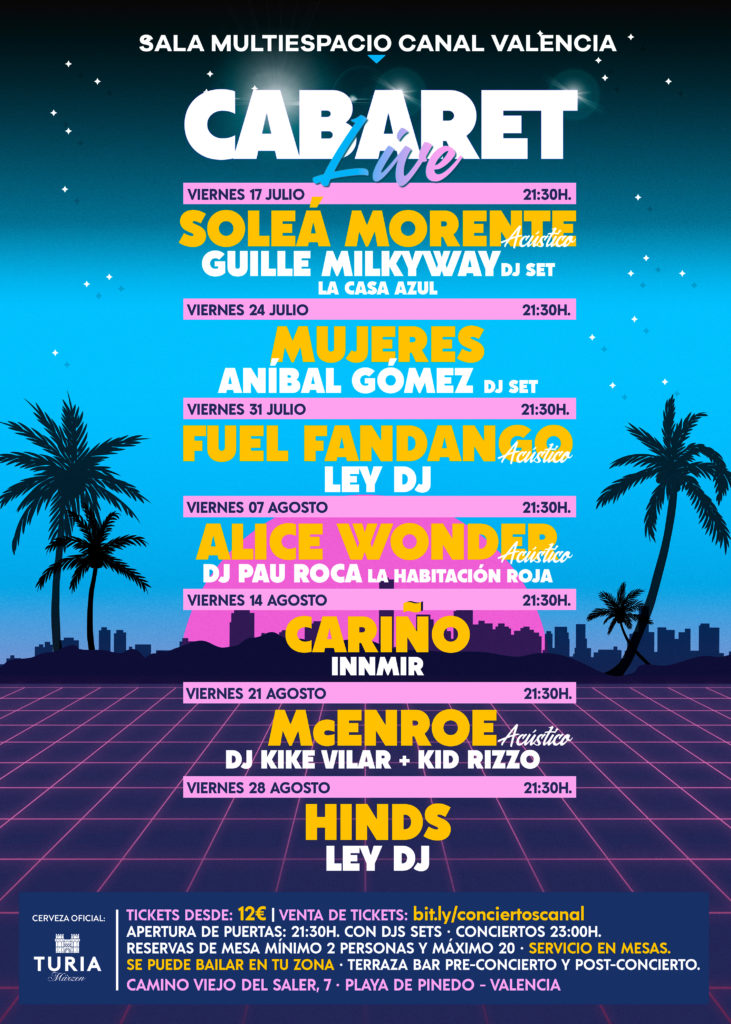 Cabaret Live, ubicado en la sala Canal, nos trae este bien cultural al lado de la playa de Pinedo, con grandes artistas nacionales que son cabezas de cartel de los principales festivales musicales de la escena pop-rock española como Fuel Fandango, Soleá Morente, Mujeres, Alice Wonder, McEnroe, Cariño o Hinds. Además, estarán acompañados por DJ’s de renombre como Ley DJ, Aníbal Gómez DJ (Ojete Calor), Pau Roca de La Habitación Roja o Innmir.