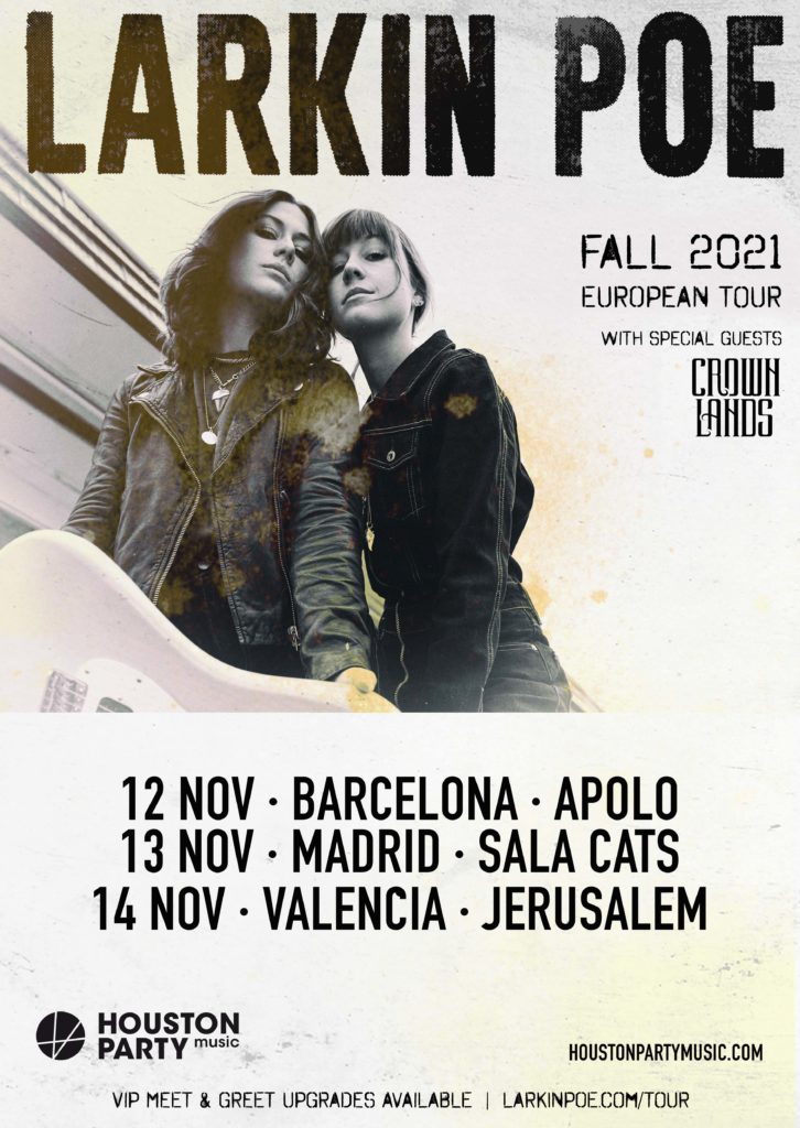 Las estadounidenses Larkin Poe, uno de los iconos actuales del blues-rock, han pospuesto su gira de 2021 de febrero a noviembre, debido al coronavirus. Las nuevas fechas son: 12 de noviembre de 2021, Barcelona (Apolo); 13 de noviembre, Madrid (Cats) y 14 de noviembre, Valencia (Jerusalem). Se cancela, sin embargo, su actuación en Santander, que estaba prevista en su tour de febrero y no tendrá cabida en el de noviembre. Las entradas ya adquiridas para Barcelona, Madrid y Valencia siguen siendo válidas. El importe de las de Santander será retornado a quienes las hayan comprado en el punto de venta donde las compraron.
