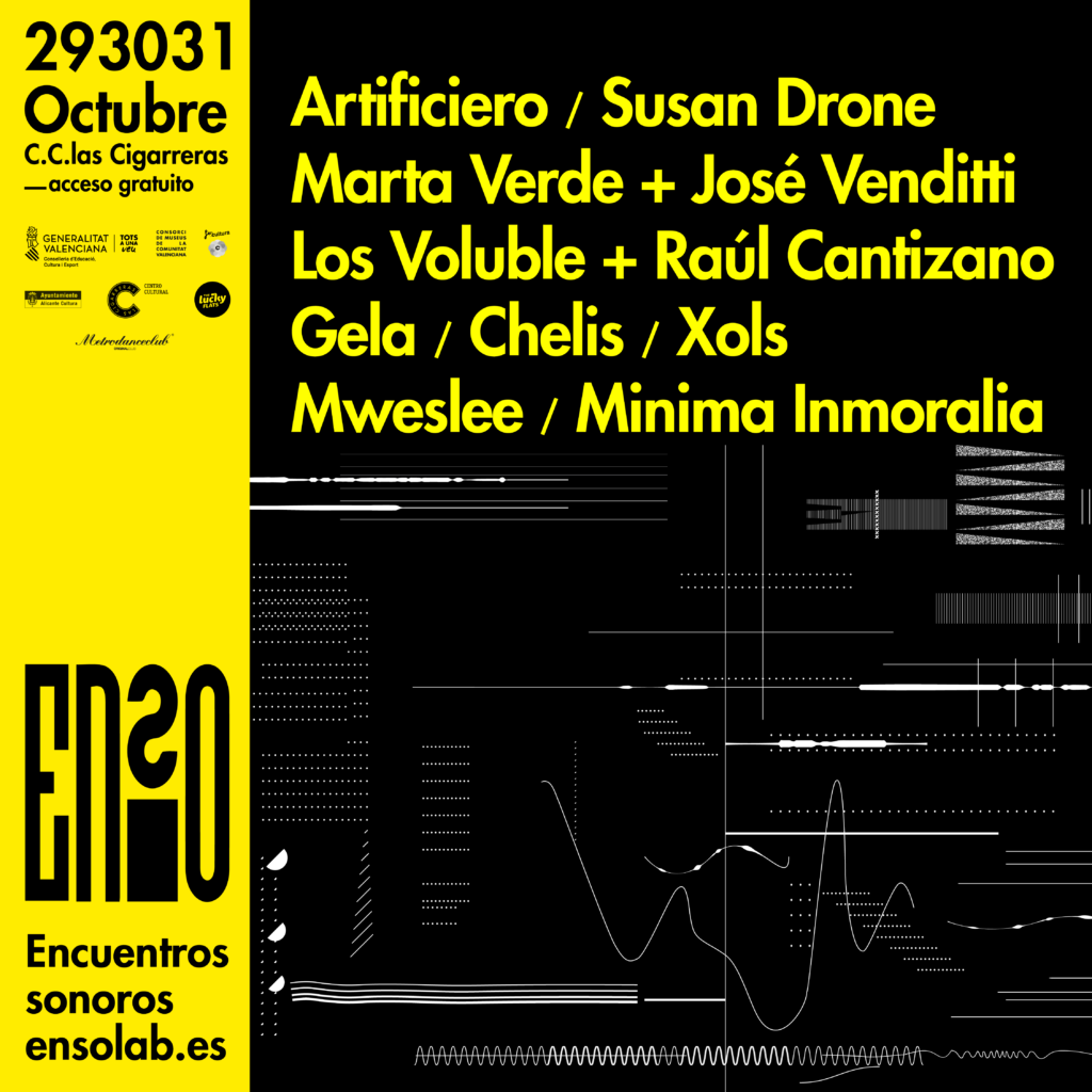 ENSO -la propuesta multidisciplinar que sinergia música, arte, tecnología y documentación sonora- crece y regresa, del próximo jueves 29 al sábado 31 de octubre de 2020, al Centro Cultural Las Cigarerras (Alicante) con una nueva apuesta en formato semi-presencial y, en esta nueva ocasión, con la intención de ampliar y consolidar el Festival de Producción y Música Electrónica ENSO y la de iniciar una transición del festival a un modelo de contenidos presenciales y en streaming.