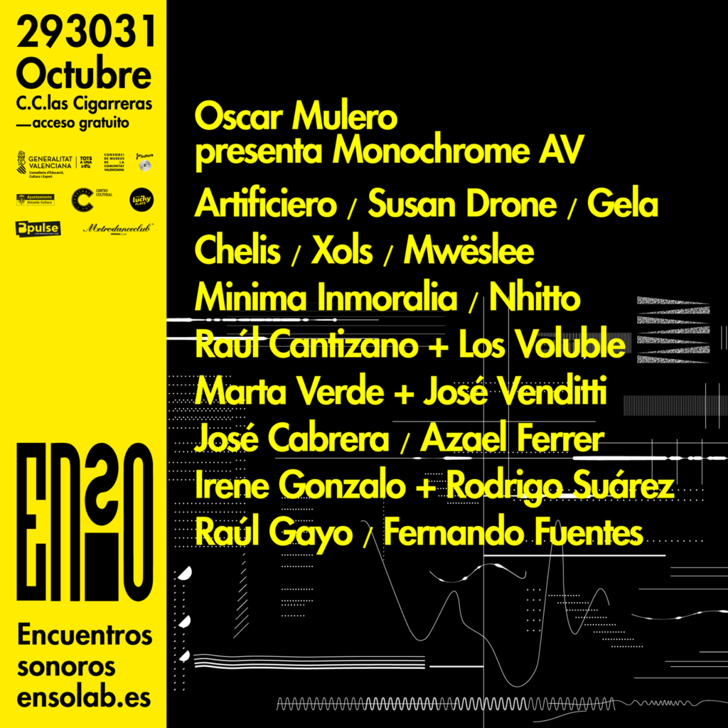 ENSO -la propuesta multidisciplinar que sinergia música, arte, tecnología y documentación sonora- crece y regresa, del próximo jueves 29 al sábado 31 de octubre de 2020, al Centro Cultural Las Cigarerras (Alicante) con una nueva apuesta en formato semi-presencial y, en esta nueva ocasión, con la intención de ampliar y consolidar el Festival de Producción y Música Electrónica ENSO y la de iniciar una transición del festival a un modelo de contenidos presenciales y en streaming.