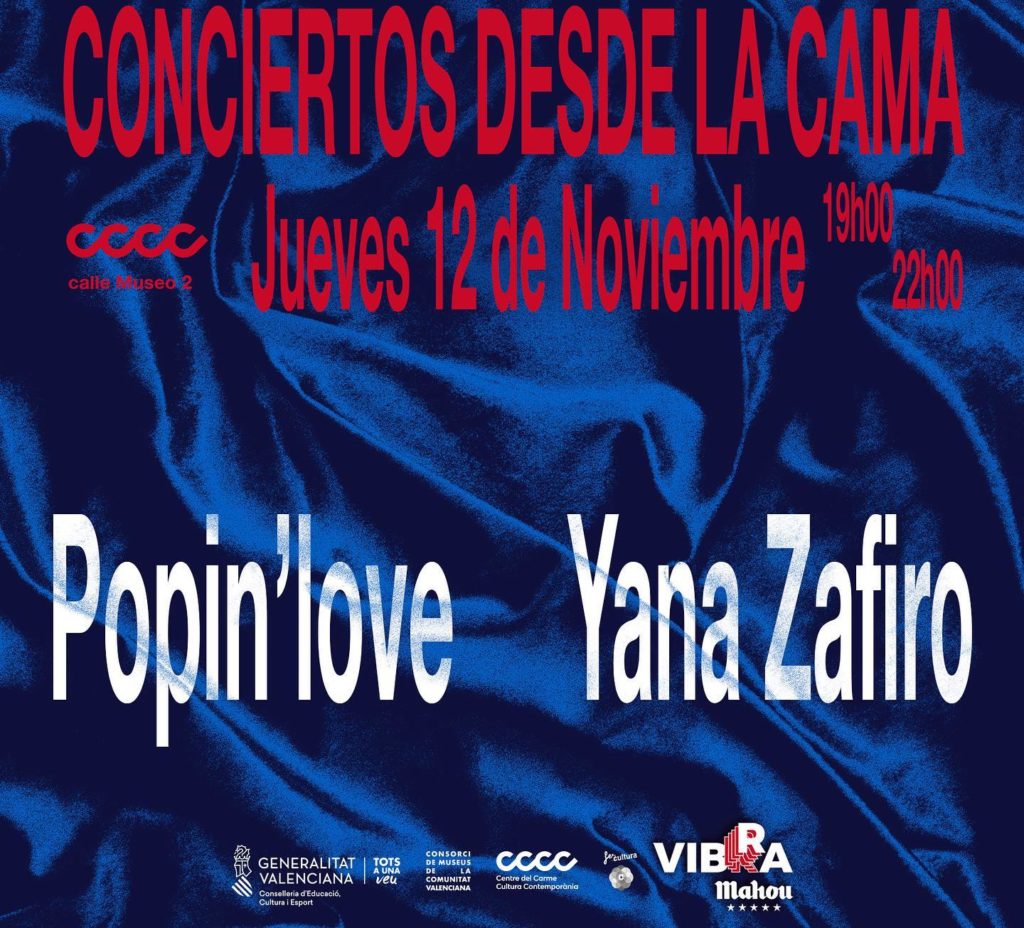 El Centre del Carme acogerá el próximo jueves 12 de noviembre la primera edición del ciclo Conciertos desde la cama. Una iniciativa puesta marcha por parte de Cero en conducta y Vibra Mahou, que se suma a esta celebración para facilitar encuentros de calidad en torno al directo. Las actuaciones correrán a cargo de dos representantes del sonido bedroom pop; la murciana de origen rumano Yana Zafiro y el artista valenciano Popin’love.