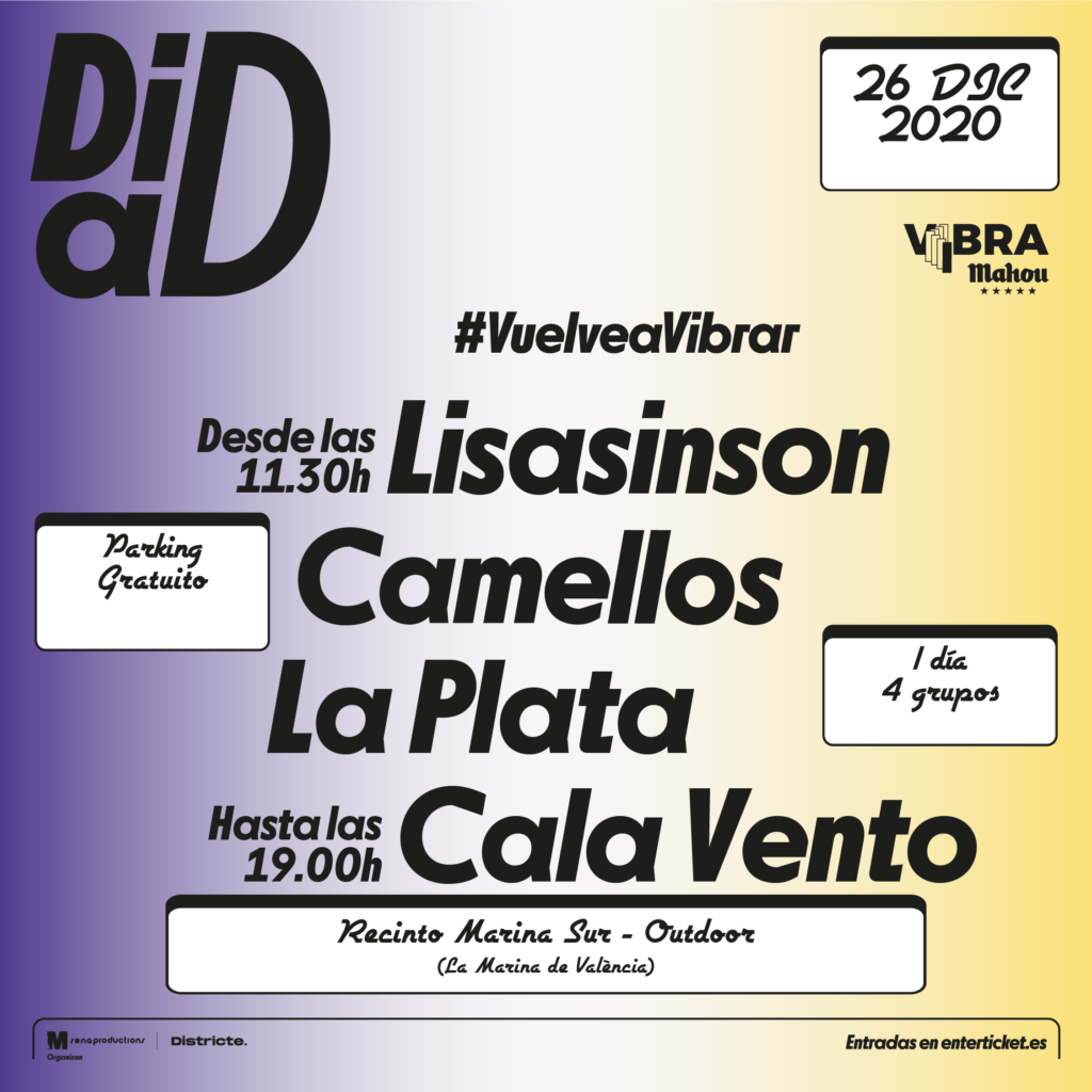 Esta Navidad música en directo. DiaD propone un sábado 26 de diciembre con las actuaciones de Cala Vento, Camellos, La Plata y Lisasinson en La Marina de València (recinto Marina Sur). Como ya ocurriera en la primera cita, Vibra Mahou, la plataforma de música de Mahou Cinco Estrellas, vuelve a apoyar la iniciativa y consolida su apuesta por crear experiencias para generar encuentros en torno a la música en directo.