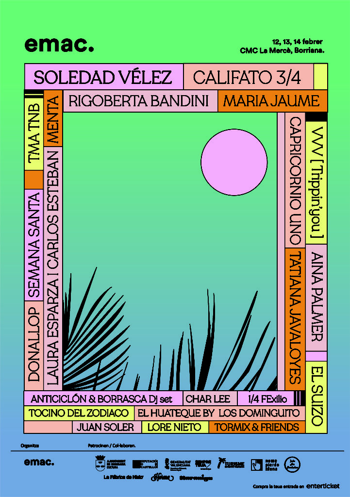 emac.2021 nos presenta un cartel coral y de alta intensidad artística, en el cual podemos encontrar nuevos valores y algunos viejos conocidos para el público del evento burrianense. A los cabezas de cartel, se suman TMATNB, VVV (Trippin’you), Menta, Semana Santa o Capricornio Uno. Un cartel que vuelve a apostar por las solistas femeninas, como ha sido ya costumbre en el emac, y también con formaciones locales como Aina Palmer, Tatiana Javaloyes o El Suizo.
