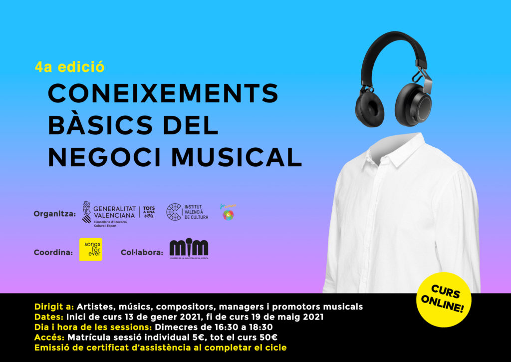 El Instituto Valenciano de Cultura (IVC) ofrecerá a partir del próximo 13 de enero de 2021 la cuarta edición del ciclo formativo “Conocimientos básicos del negocio musical”, dirigido a músicos, artistas, promotores, programadores, managers y agentes culturales que quieran obtener las herramientas necesarias para ampliar sus conocimientos y trabajar en un sector que en estos momentos se encuentra ante el reto de adaptarse a las nuevas circunstancias generadas por el efecto COVID.