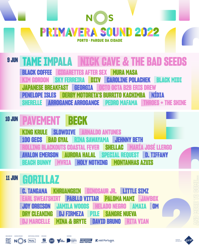NOS Primavera Sound Porto también mira ya hacia 2022, el año en que recuperaremos el tiempo perdido. Una semana después de desvelarse el cartel de Primavera Sound Barcelona – Sant Adrià 2022, la edición portuguesa del festival anuncia el lineup con el que celebrará su 9º aniversario del 9 al 11 de junio de 2022, encabezado por Tame Impala y su psicodelia multicolor, los Gorillaz de Damon Albarn, Nick Cave and the Bad Seeds en una nueva cita con la eternidad, el icono Beck, los resucitados Pavement, Little Simz como nuevo referente del rap británico, la siempre inquieta Kim Gordon y King Krule aullando desde las tinieblas. A falta de algunos nombres que completarán el cartel durante las próximas semanas, son 61 los artistas con sello 100% Primavera Sound que nos acompañarán en el ansiado retorno al Parque da Cidade.