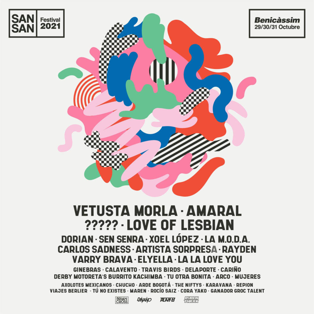 Sin duda, lo más llamativo del SanSan 2021 es el cartel programado, todo un homenaje a la música en directo y a los festivales, los grandes perjudicados por la pandemia. Pesos pesados de la escena se unen a nuevas propuestas musicales de estilos muy diversos: Vetusta Morla, Amaral, Love of Lesbian, Dorian, Xoel López, La M.O.D.A, Sen Senra, Rayden, Carlos Sadness, Elyella, La La Love You, Varry Brava, Travis Birds, Cala vento, Delaporte, Derby Motoreta’s Burrito Kachimba, Arco, Tu Otra Bonita, Ginebras, Mujeres, Chucho, Cariño, Arde Bogotá, The Niftys, Axolotes Mexicanos, Karavana, Repion, Tú no existes, Maren, Rocío Saiz o Cora Yako se subirán a sus distintos escenarios.