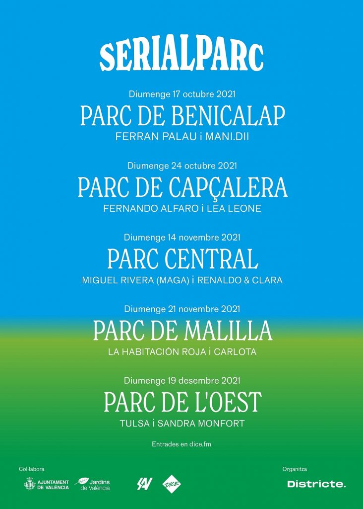 La Habitación Roja y Carlota, Ferran Palau y Mandi.di, Fernando Alfaro y Lea Leone, Tulsa y Sandra Monfort o Miguel Rivera (Maga) y Renaldo & Clara. Grupos y artistas incontestables, con trayectorias consolidadas, actuarán junto a nuevas propuestas que deslumbran en lo reciente. Un cruce generacional lubricado por el indie, el rock, pop urbano y las texturas electrónicas. Con paridad y diversidad en las procedencias, cada parque ejerce de anfitrión para emparejamientos insólitos que atraen a públicos amplios hacia localizaciones imprevistas. De nuevo, el parque como espacio para la mezcla. Demostramos que los parques son un escenario idóneo para reunirnos, sentir en grupo, demostrar la fuerza conjunta.También artísticamente.
