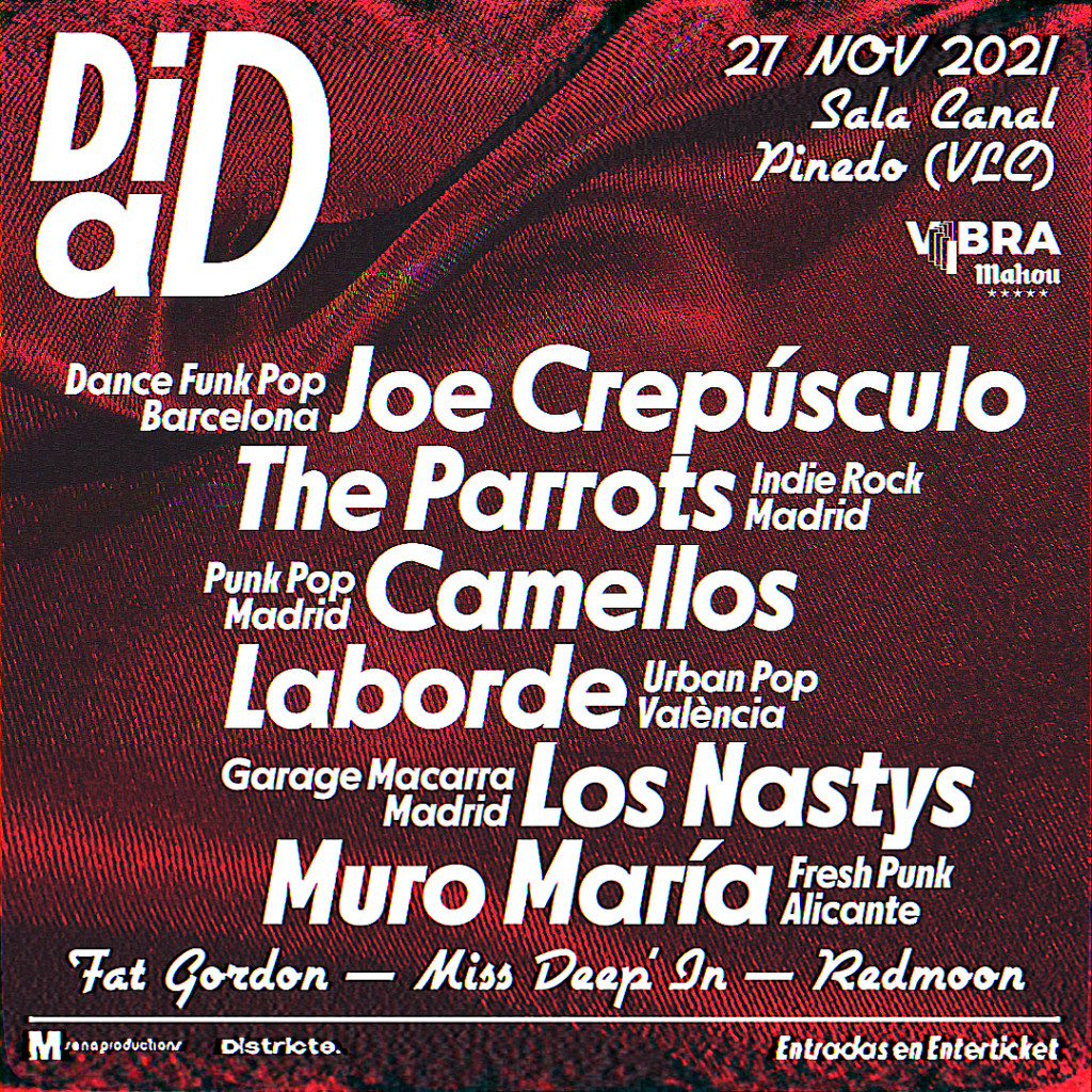 Tras el éxito de las primeras citas y unos meses en barbecho, vuelve DiaD el próximo 27 noviembre en la Sala Canal con las actuaciones de Joe Crepúsculo, Camellos, The Parrots, Laborde, Los Nastys y Muro María. Frescura, irreverencia y desparpajo son adjetivos comunes a los protagonistas de un cartel que hará vibrar a los asistentes con sus directos únicos.