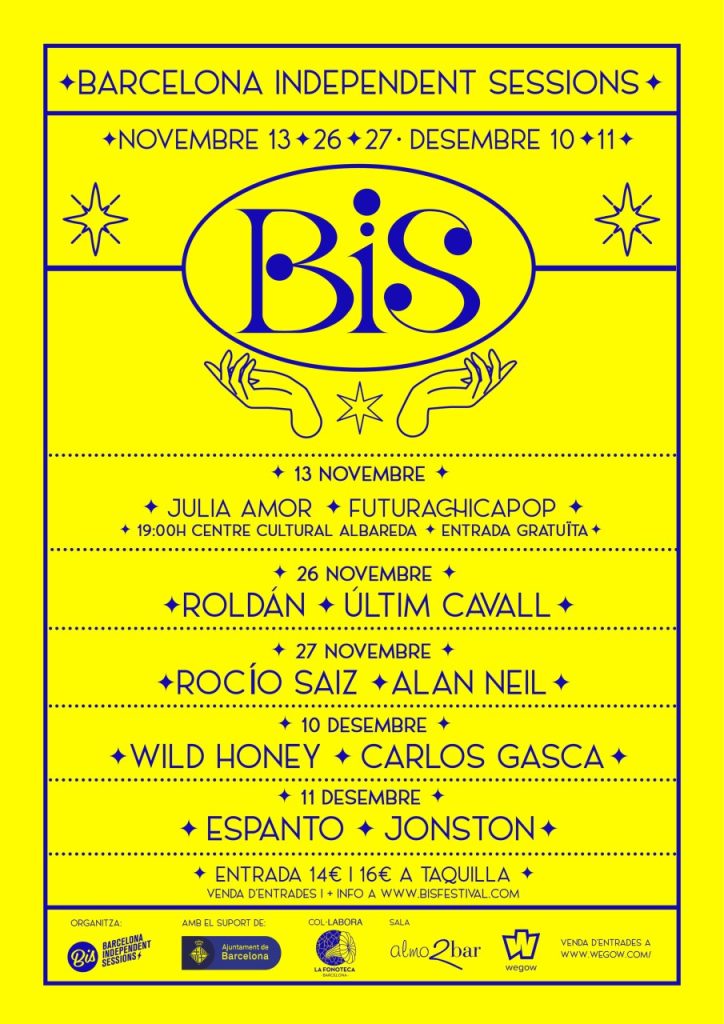 El Bis Festival celebra su séptima edición con Rocío Saiz, Espanto y Wild Honey entre los confirmados. Las Barcelona Independent Sessions vuelven con 5 sesiones los días 13, 26, 27 de noviembre y 10 y 11 de diciembre. Completan el cartel de esta edición nombres como julia amor, Futurachicapop, Carlos Gasca, Últim Cavall, Jonston, Roldán o Alan Neil.